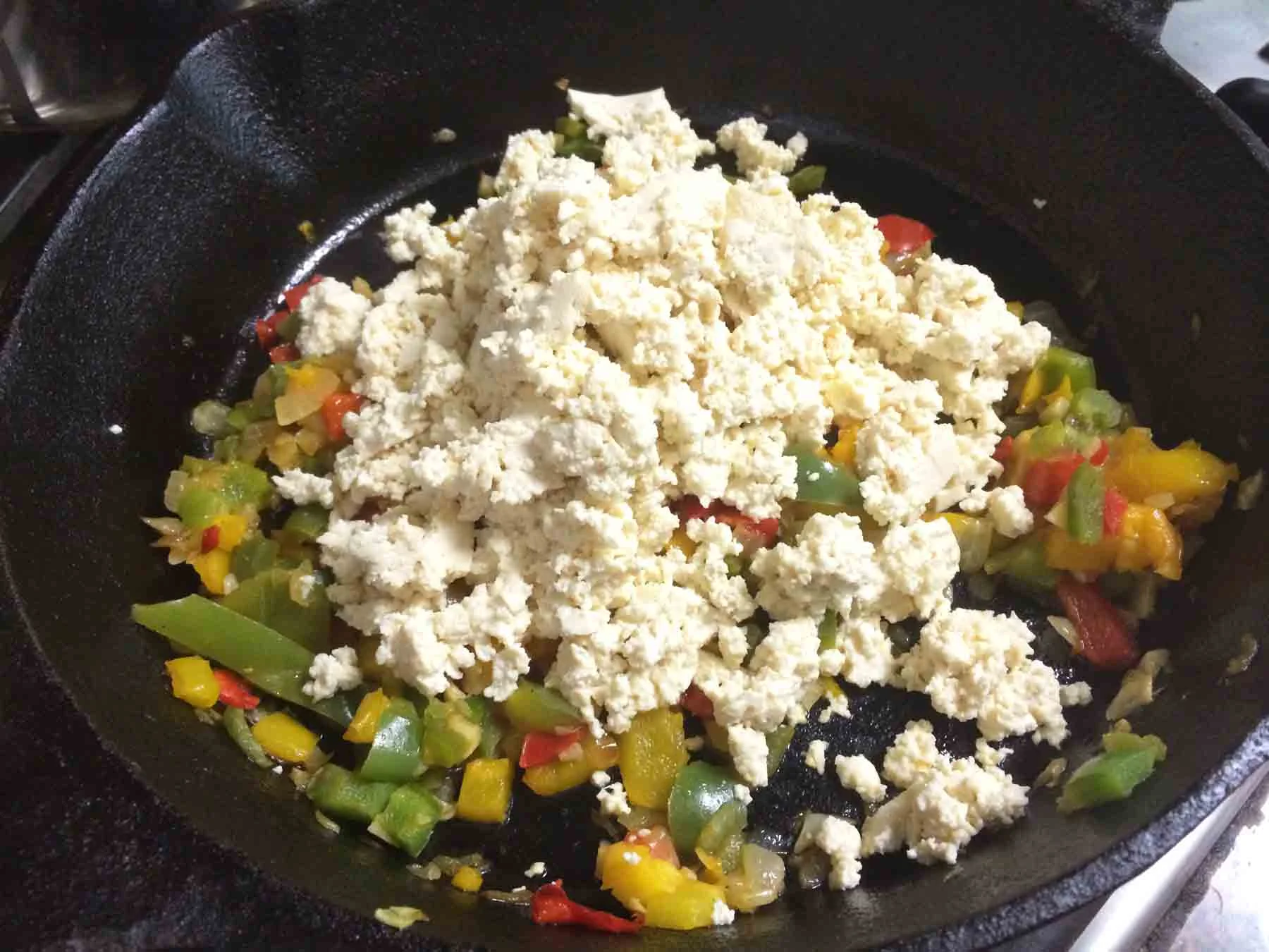 Get a pan all hot & bothered and then lube it up with some olive oil. Add your diced onion and "spanked" garlic and let the onion get juicy and translucent. Then add the chopped bell pepper and watch them get sweaty. Drain your tofu and give it a good squeeze to get the juices out. Then really manhandle it as you crumble the tofu over the smoldering onion, garlic, and peppers.