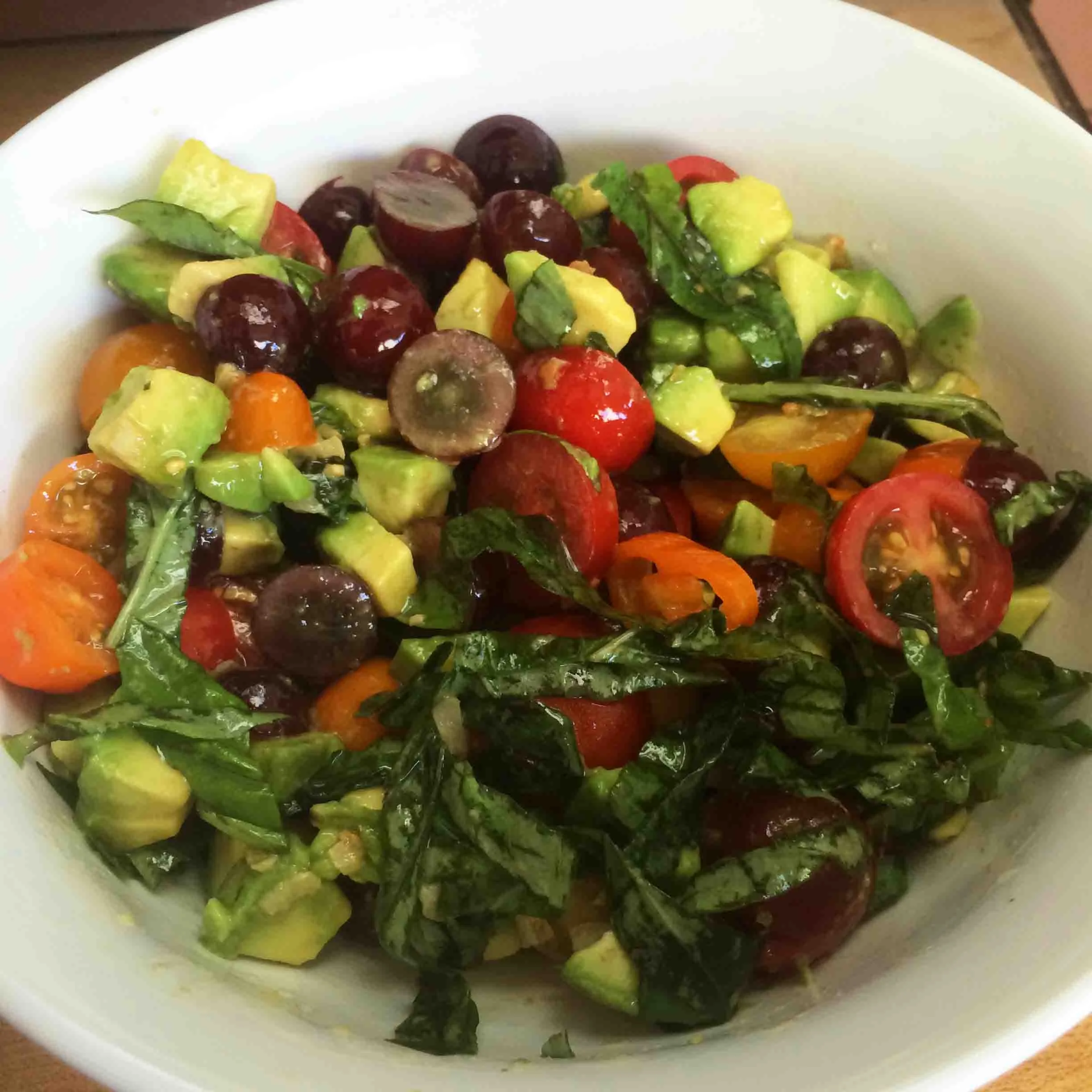 Start with a medium bowl. Toss in your juicy tomatoes, plump grapes, and creamy avocado. Roll up your basil leaves and slice across the roll to make pretty basil streamers. Then let it rain.