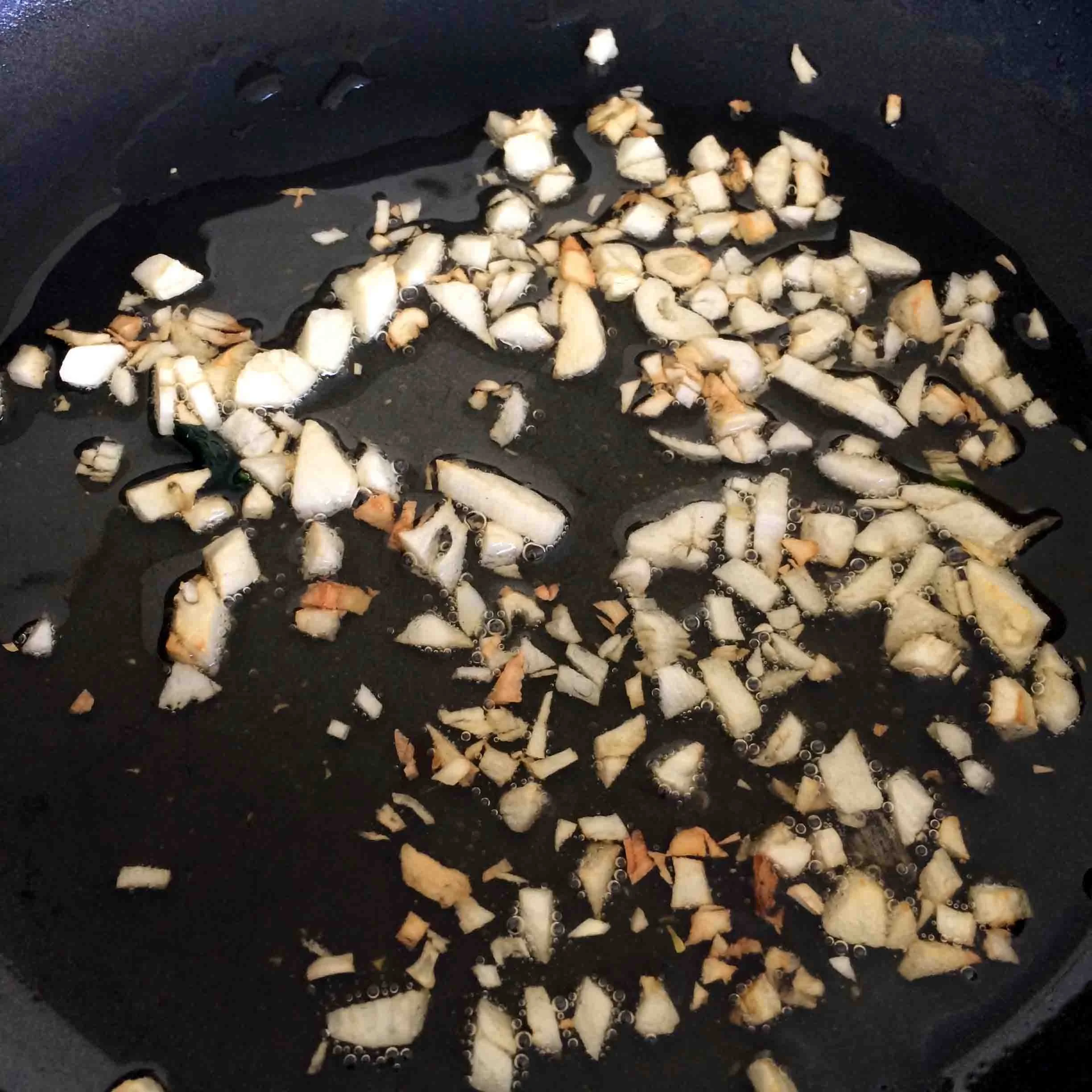 Now get a pan nice and hot and lubricate it with about half of your olive oil. Add your minced garlic and let it get toasty in the hot oil. When it's looking tanned, pour the oil and garlic and salt over your bowl of Sexie and leave them to mix it up a bit.